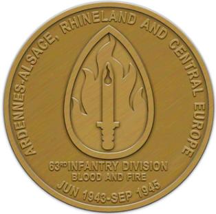| The images shown are not actual size or color. The actual size is 39mm or about 1 1/2 inches in diameter. Coins are 3mm thick, the edges are traditional ridged like a dime and each coin weighs approximately 1 oz. The finish for the 63rd Infantry Division coin and the 254th Infantry Regiment coin will be Antique Bronze. Costs per coin is $15.00 including shipping and a plastic protective capsule. Mail your orders to Fred Clinton 102 S. Jenkins Street, Alexandria, VA 22304. Make checks payable to Fred Clinton. All monies received will go towards cost of the 63rd Infantry Division Website and costs of the challenge coins, plastic capsules and postage. At this time I am not in position to provide coins for the other organic units of the 63rd Infantry Division because of the costs of the original dies which run around $600 plus and then the costs of the coins which have to be ordered in quantities of 50 or more |