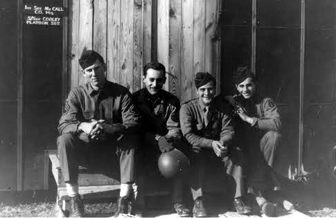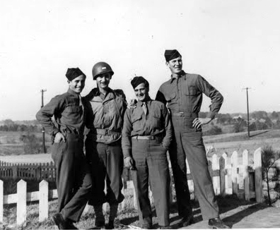 | Members of B Company, 363d Medical Battalion, Camp Van Dorn, MS 1943. L-R: Pvt Serafino A. Risi, T/5 Murray L. Fink, Pvt Dominic A. Andreaccio and S/Sgt Alfred Deischel. |
