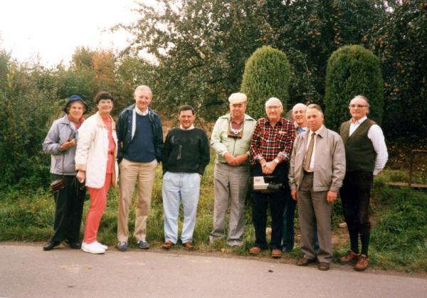 | Photo taken by Herr Rolf Meister, German Historian in 1988 during a visit of A Company, 253d Infantry Regiment veterans to the Buchhof/Stein area. L-R: Mrs Urban and Mrs Vermillion, Dr. Linscott , Professor Dr, Guenther Beck-German Historian, Pfc Clifford Urban, T/Sgt Carl A. Jackson, S./Sgt Paul Vermillion, Hermann Henninger and Freiherr Von Goler Ravenburg. |