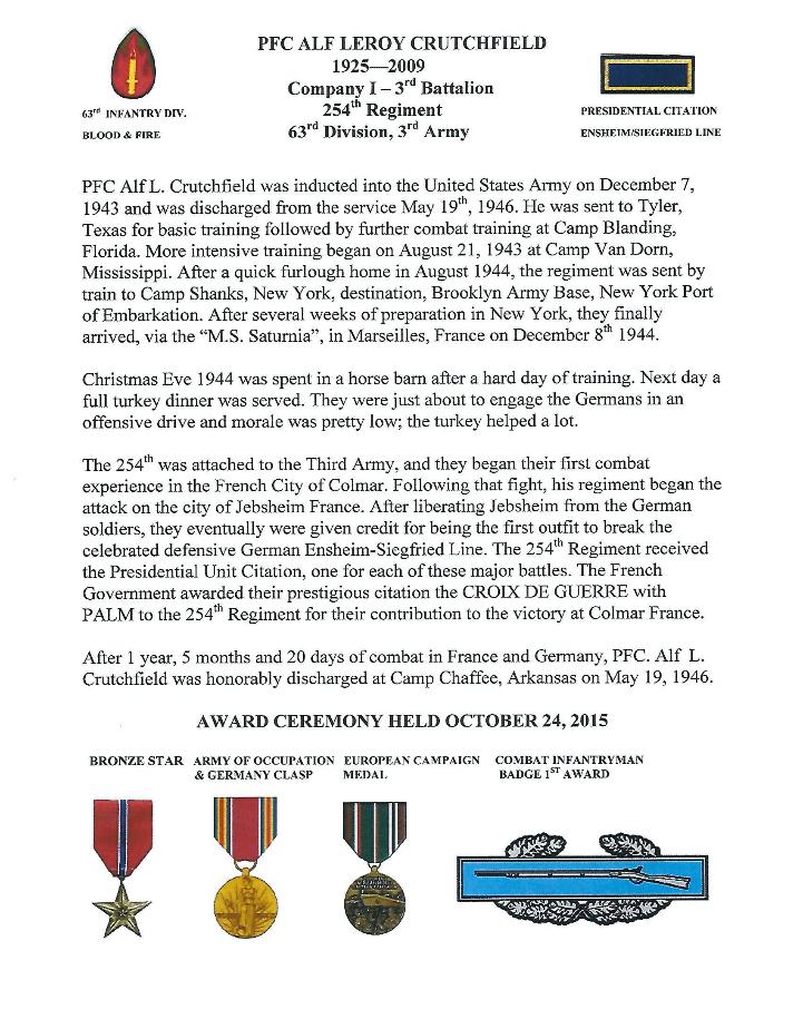 | The next few photos and Bio, pertain to Pfc Alf L. Crutchfield, I and M Companies, 254th Infantry Regiment. Pfc Crutchfield's widow, Imogene, contacted the Webmaster and Historian of the 63rd Infantry Division and found that Pfc Crutchfield qualified for the award of a Bronze Star Medal for Meritorious Service based on his earning the Combat Infantryman Badge. Mrs Crutchfield made the application and the results are shown below. |
