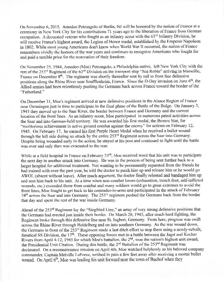 | On 6 November 2015, Pfc Amedeo Petrongolo, G Company, 253d Infantry Regiment was awarded the French Legion of Honor. The following bio and photos relate to that presentation. |