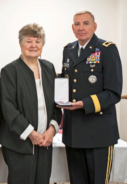| Mrs Imogene Crutchfield and Major General Asher at the presentation ceremony for Pfc Crutchfield's Bronze Star Medal |