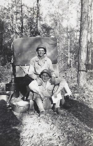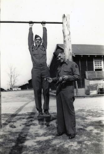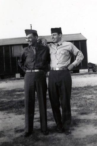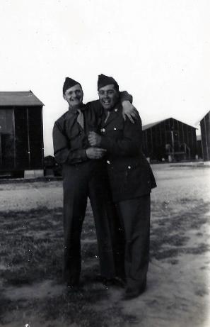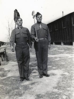| L/R: T/5 Joseph L. DiSipio and Cpl James V. Short- ready for barracks duty. 1944 |