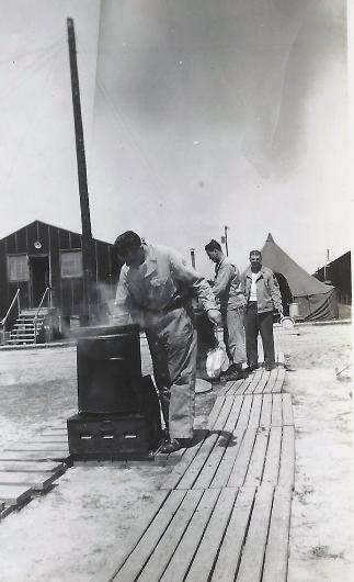 | Cpl James V. Short cleaning his mess kit after dining outside. All 63d Infantry Division units were required to prepare meals and eat outside. Thus the name was given to MG Louis Hibbs- "Mess Kit Louie". This was a method of preparing us for the rigors of combat. |