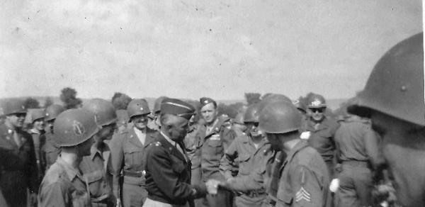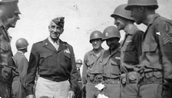 | Major General Louis Hibbs, 63d Infantry Division Commanding General meets with some of his soldiers during the division field day. 1945 |