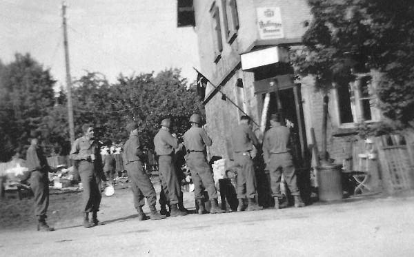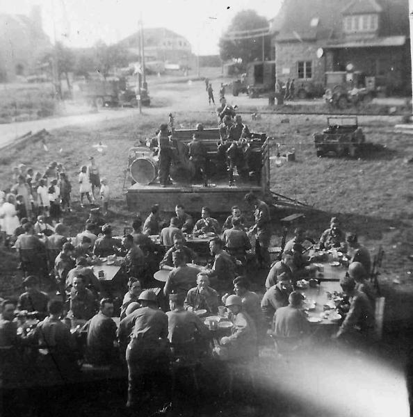 | Chow time for Service Company, 254th Infantry Regiment in Gernbonn, Germany- 1945. A little dinner music also. |