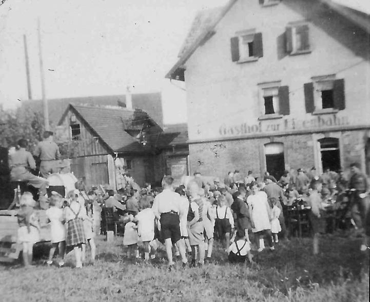 | Local children enjoying the music during chow time with Service Company, 254th Infantry Regiment- Gernbonn, Germany 1945 |