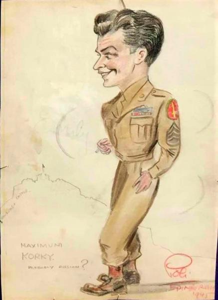 | Caricature of S/Sgt Roman J. Korczynski, I Company 255, Infantry Regiment. Photo furnished by his son Tom Korczynski. |