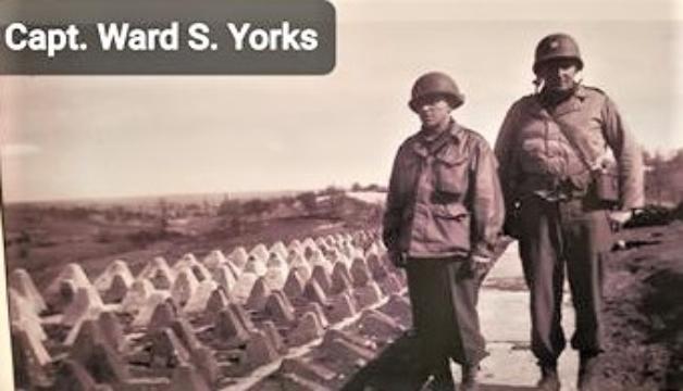 | Capt Ward S.Yorks (on the right) at the Siegfried Line. Capt Yorks was assigned to Headquarters, 3d Battalion, 253d Infantry Regiment. Unidentified chaplain (on the left) |