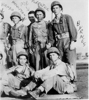| For some reason the complete photo was not provided. Some of the members of this I Company 254th Infantry Regiment Rifle Squad are cut off on the left. Seated L-R: Pfc Harold K. Elliott (KIA-only a portion of him is shown)- Pfc Hubert Schwartz and squad Medic(not identified). Standing L-R: Pfc James A. Hanna (only partially shown), Pfc Earl B Heckman (KIA),??????, Pfc Leo Forester and S/Sgt William E Byrnes . Photo furnished by Rick Meier, Nephew of Pvt Palermo. |
