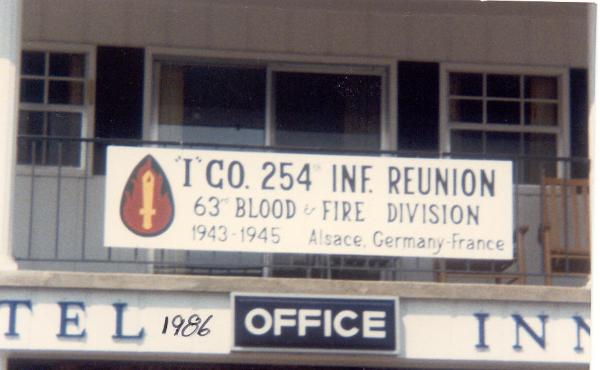 | Sign at hotel in Franklin, Tenn announcing the 1986 reunion of I Company, 254th Infantry Regiment. Photo furnished by Rick Meier, Nephew of Pvt Rosario Palermo . |