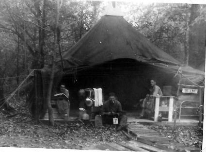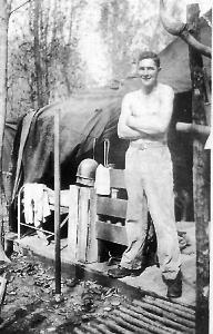 | Sgt Robert J. Bartholomew in front of his tent at the 63rd Ranger Platoon Beaver Creek encampment. December 1943 |