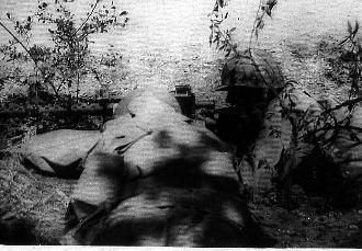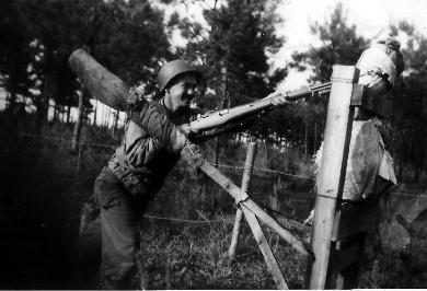 | Center with back to camera, Sgt Robert J. Bartholomew and firing the machine gun is Pfc Arthur F. Christie on a mission to ambush recon patrol from a division unit. 63rd Ranger Platoon, 1943 |