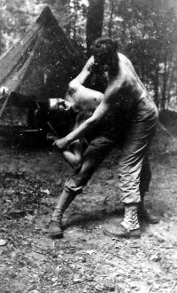 | L-R: Sgt Robert J. Bartholomew and Pfc John J. Collins practicing their hand-to-hand combat skills at the Beaver Creek encampment. 63rd Ranger Platoon, 1943 |