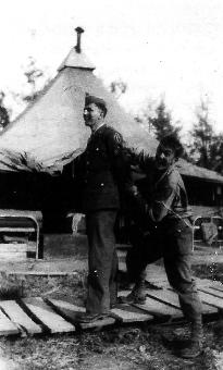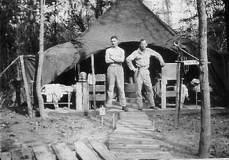 | L-R: Sgt Robert J. Bartholomew and Pfc Arthur F. Christie in front of their tent at the Beaver Creek encampment. 63rd Ranger Platoon, Dec 1943 |