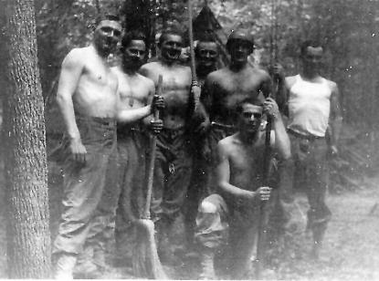 | L-R: Pvt Reginald F. Fuchs, Pfc James M. Eddy, Pfc William R. Cunningham, Pfc Douglas Pace, Pvt George A Savelli and Pfc Peter J. Swayze, gathering firewood for the 63rd Ranger Platoon camp site at Beaver Creek- 5 Dec 1943. |