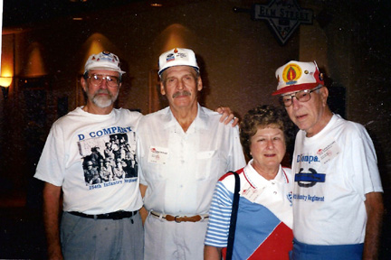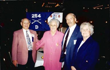 | L-R: Pfc Fred Clinton, Cpl Bill Pink, Rhea Lazar wife of S/Sgt Ralph Lazar and S/Sgt Charles A. Stewart at the Cincinnati, Ohio reunion in September 1995. D Company 254th Infantry Regiment |