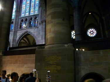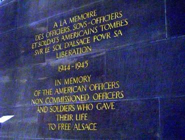 | The left photo shows an inscription in the Cathedral of Strasbourg, France honoring the American soldiers who gave their lives to free Alsace during WWII. The right photo is a close up of that inscription. These photos were provided by Javier Tome. |