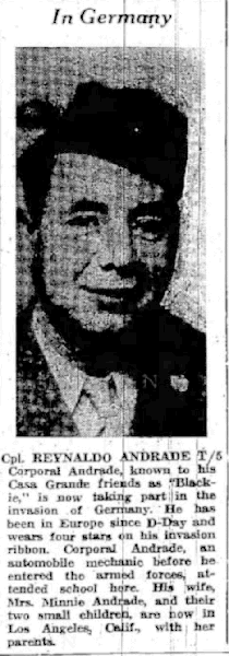 | T/5 Reynaldo Andrade, B Company, 263d Engineer Combat Battalion. He joined the 63rd Infantry Division in September 1943 at Camp Van Dorn. In February 1944 he transferred to the 83rd Infantry Division. Photo provided by Remy Mortelette. |