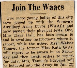 | Sister of Sgt George E. Gries, C Battery 863d FA Bn, Miss Ruth Gries, joins the Women's Auxiliary Army Corps. |