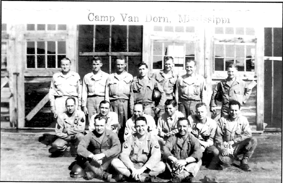 | Captain Charles R. King, Service Company, 254th Infantry Regiment sent this photo of the Maintenance Section of the 254th Infantry Regiment Motor Pool. None are identified. He would like to hear from any of these men. Captain King can be contacted at 12272 River Road, Richmond, VA 23238-6100 |