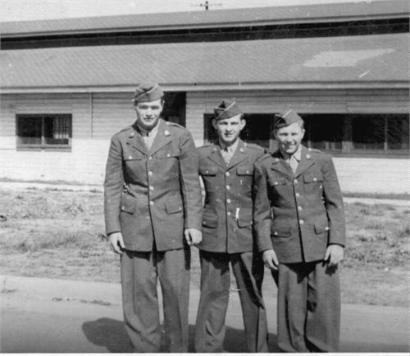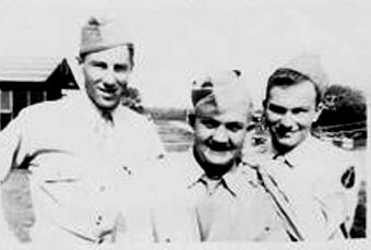 | L-R:T/3 James "Red" Gerrity, Med Det 254th Inf, S/Sgt Jack T. Gilberson, C Company 253d Infantry and Cpl Edward F. Fowle Jr, Headquarters Battery, 862d FA Bn, Camp Van Dorn, MS 1944 |