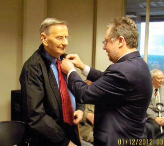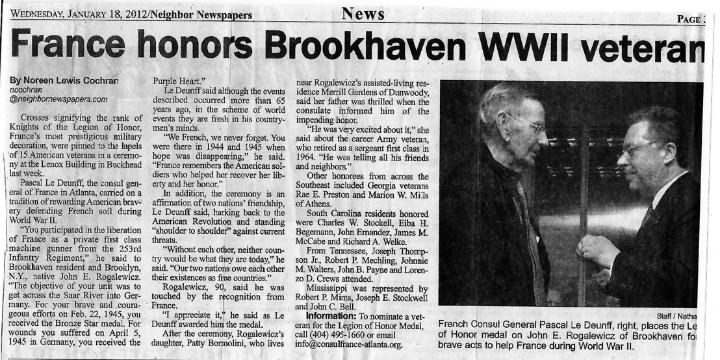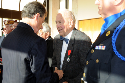 | Pfc John E. Rogalewicz, G Company 253d Infantry Regiment receives the French Legion of Honor from French Counsul General Pascal Le Deunff in January 2012 |