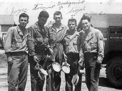 | L-R: Pfc Richard W. Joyce, Sgt Louis W. Tremont, Sgt Richard W. Nordquist, Sgt Samuel Siegel and Sgt Silvio E. Petricciani, Anti Tank Company, 253d Infantry Regiment, Camp Van Dorn, MS 1944. |