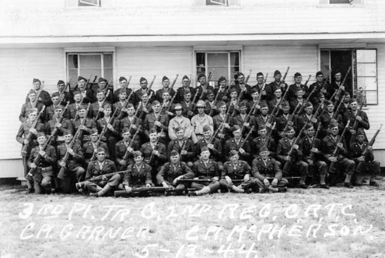 | Photo of Sgt Lester M. Hayes(L Company 254th Infantry Regiment) basic training group. Sgt Hayes is not identified in the photo. |