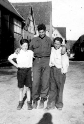 | Pfc Frank A. Kogut with a couple of the local children. D Company 255th Infantry Regiment- Germany 1945 |
