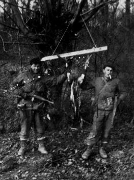 | Pfc Frank A. Kogut, D Company 255th Infantry Regiment after a successful hunt. The other soldier is not identified- Germany-1945 |